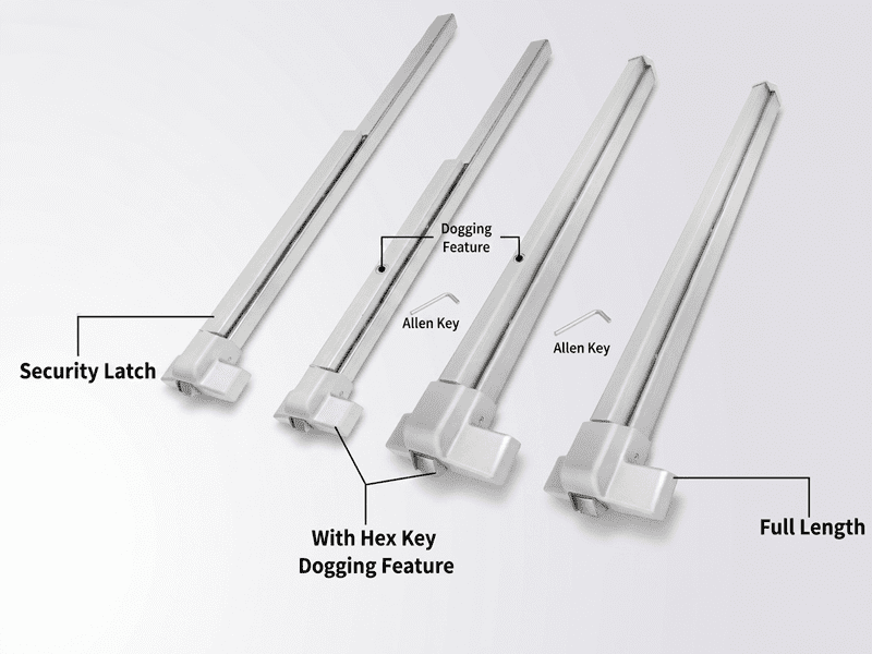 The full panic exit function across all models is designed to meet emergency exit safety requirements for fire doors, stairwell doors, escape routes, and commercial and public building exit compliance — supporting safety certification requirements for the environments in which they are installed.