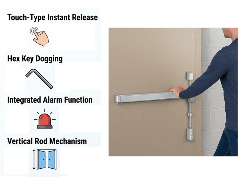 All Touch Type and Vertical Rod models are non-handed, making them suitable for installation on both left-hand and right-hand doors without requiring model-specific ordering. This simplifies procurement and reduces installation planning complexity.